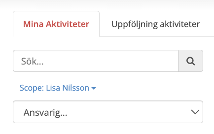 Nu går det att filtrera på Scope i fliken Mina Aktiviteter vilket gör att användare kan se aktiviteter från andra användares perspektiv exempelvis om man måste hoppa in för någon som är sjuk.